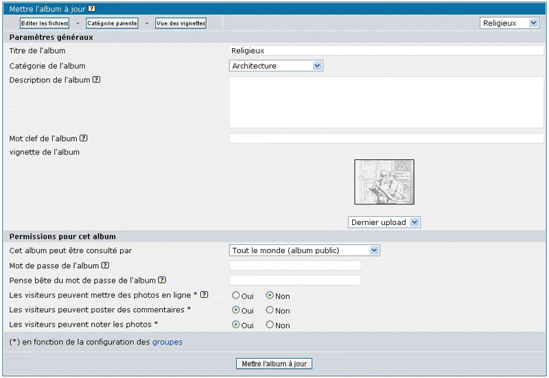 L'administrateur peut créer des albums dans toutes les catégories. Si vous voulez créer un album personnel en tant qu'administrateur, choisissez "* Ma galerie *" dans sélectionnez une catégorie pour votre album personnel.