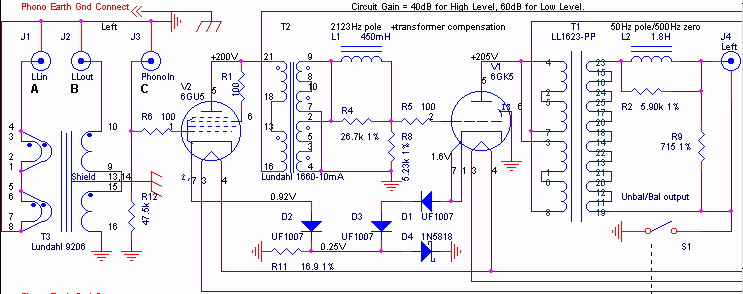 There is also another way of lowering AND compensating the output impedance, and that is by the use of positive current feedback. Take a quick look at the schematic just below. Note that there is a common path for the two cathodes to ground at D4. By coupling the cathodes together like this and properly phasing the interstage transformer, there is a small degree of positive current feedback introduced. Positive current feedback LOWERS output impedance. Since the system frequency response (RIAA) is highest at low frequencies, the feedback occurs only at these frequencies, and there is correspondingly no loss in resolution due to the feedback.