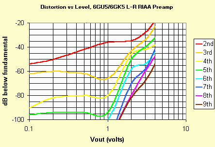 Note that even at highest cartridge outputs, distortion is low. For instance, with a 50mV (!) MM cartridge, the output will be 5 volts from this stage (at the plate) and distortion only 0.2%. Also with only 0.5pF capacitance grid to plate, Miller effect translates this to only about 50pF, which is perfectly acceptable.