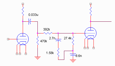 For the 50kHz zero, lets consider the fully interacting pole-zero network discussed last time (that is, rather than C2 positioned at the plate of the second tube, it is placed across R5. Remember this caused R5 to change to 27k, and the capacitor in parallel with it was 2.95nF). We can create a zero at 50kHz by placing a resistor in series with that capacitor. A resistor value of 1.58k provides the required attenuation of 47.5dB. When we do this, however, the capacitor needs to change from 2.95nF to 2.7nF. Also the combination of the new LF pole and the new HF zero require a slight alteration of R5 to 27.4k.
