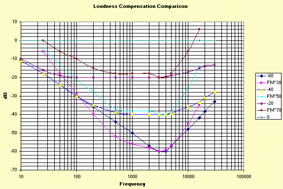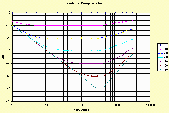 There are some interesting items to note in this curve. The low frequency "pole" shifts upward as the level is reduced, and the actual high frequency compensation "slope" is quite high, changing about 15dB from 4kHz to 15kHz (which corresponds to about 2 "zeros" of real compensation). Many "loudness compensation" schemes provide a "fixed pole-zero" on the low frequency end, and some ignore the high frequency compensation altogether.