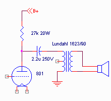 To verify that the driver stage was going to be acceptable, I turned it into a full SE amplifier simply by adding a transformer to the output of the 801 AFTER the output coupling capacitor, so as to preserve the stage operating points as much as possible. The "snippet" of schematic to do this is: