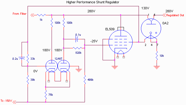 Note that I have also "presumed" a -150v regulated source is available. I've also shown the "quiescent" voltages for this supply to make it more obvious how it operates. The added tube is a differential amplifier that amplifies the "error", sensed from the bottom of the 0A2 and referenced to the -150V source. Some level of output voltage adjustment can be achieved by altering the 33k/39k voltage divider ratio. Since I am placing about 13 mA thru the VR tube, and the 12AX7 draws an additional 2 mA, I have lowered the series resistor to 1k. (So I can actually get slightly more current from this supply without exceeding the EL509 tube limits.