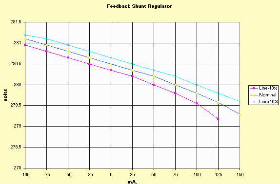 Note that the effective output resistance is about 40 ohms. Also note that the curves are notably different form the simple series regulator as I described above. (Specifically note that with series regulators, the regulation is "better" at high loads, and gets worse at low or negative loads. With the shunt regulator, the regulation is better at low or negative loads, and gets worse at high loads). Technically, since the tube is dissipating its rated power at zero load, "sourcing" current would over-dissipate the tube. For dynamic loads this is not a problem, since the power averaged over a load "cycle" would still be within limits.