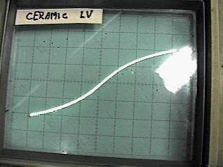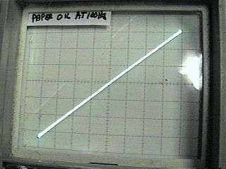I measured several different types of parts, and captured the results (simply by training a camera at the scope). The value of each of the capacitors was constant, 0.1uF. The signal level was held constant at about 70 volts RMS at 600 Hz across the capacitors. (for about 26mA signal current). This is probably more than you would normally expect, and serves to show the results better. A number of capacitor types were used in this experiment. The first series of curves show paper and oil, polycarbonate film, polyester film, polystyrene film, polypropylene, 100 v olt and 1000 volt ceramic and silver mica. Here's the results: