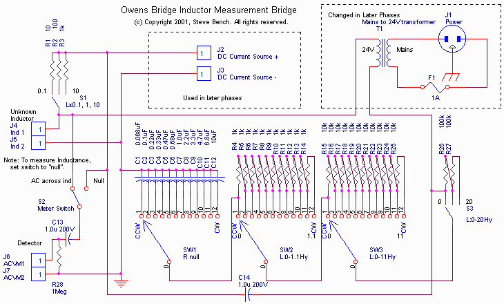 The circuit is very much like the idealized bridge as described in part 1. R1 of the idealized bridge is the S1/R1-R3 portion of the circuit. This serves as the L*0.1, L*1, L*10 selector in the instrument. C2 of the idealized bridge is C14 in the instrument. That is why C14 should be selected close to the proper value. (See the Calibration section below). R3 of the idealized bridge is SW2, SW3, S3 and R4-R27 in the instrument. C3 of the idealized instrument is SW1 and C1-C12 of the instrument.