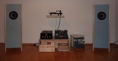 Shown in the photo is my hi-fi stereo setup with and new pair of open cabinet speaker which I built. The diy speakers use a single Seas FA22RCZ driver per cabinet. The Seas FA22RCZ is a 200 mm (8") diameter fullrange driver with a sensitivity of about 94dB. The cabinet has an open bottom, see the Seas FA22RCZ Fullrange in Open Speaker Cabinet photo for more details.