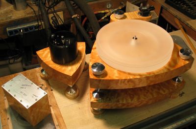 DIY turntable project. I used MDF filled with concrete / latex added to mix then veneered with Quilted Maple. The bearing is High grade SS and the cup is made of Oilite. The spikes are 2 piece with a rubber damper inside. The Motor is powered by a UPS battery enclosed in the small matching box.