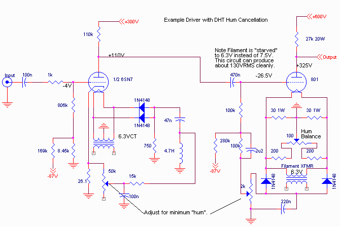 There is a MUCH simpler "compromise" network that can provide very effective control. As I mentioned above, the phase of the induced hum components is such that a negative full wave rectifier injected on the grid or a positive full wave rectifier injected on the plate is of the correct phase to cancel this hum. Therefore by adding THREE COMPONENTS to the typical circuit, the DHT hum introduction can be cancelled. Here's the circuit: