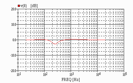 The second stage has an effective cathode bias of about 0.88 volts. For the bias point chosen, the stage gain is slightly over 6 with an effective output impedance of about 20k. Due to the relatively low values of the loading components chosen, there is a loss through the tone stack of slightly over 18:1. Thus, the system exhibits a gain of about unity (see the plots below).