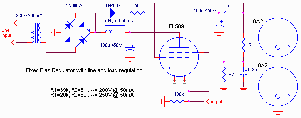 Again, one resistor and the 2 VR tubes have been added. Note, however, that this time I'm also running the screen voltage from the regulated supply. Since there is some added screen current, I've lowered the dropping resistor from 8k to 5k, in order to supply this added current.