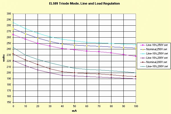 This second point is important. For the previous "improved triode" regulator, at 50mA draw, the voltage varied from 226V to 250V to 276V as the line changed from -10% to nominal to +10%. With this circuit, the change at 50mA is 239V to 254 volts! Because the voltage on the plate does vary, even maintaining a constant grid voltage allows the output voltage to vary somewhat.