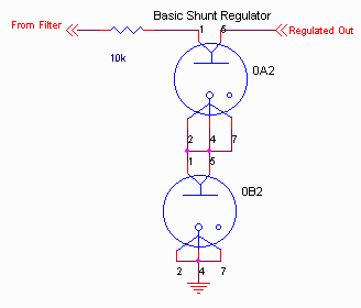 Shunt regulators of the simple type are often used as part of series regulators. We used them in parts 1-4 of this series as VR tube references. They are the classic "zener" regulators. However, these have a limited output capability. The final part of this tube regulator series investigates not only the classic VR tube references, but also single tube shunt regulators and feedback multiple tube shunt regulators. This appears to be not widely applied. I could not find much in the way of references to tube controlled shunt regulators, except for very high voltage and low current applications. (The old tube based color TV's used a shunt regulator to maintain the picture tube "anode" voltage; typically using a 6BK4 as the shunt regulator element. Ditto for oscilloscope HV supplies).