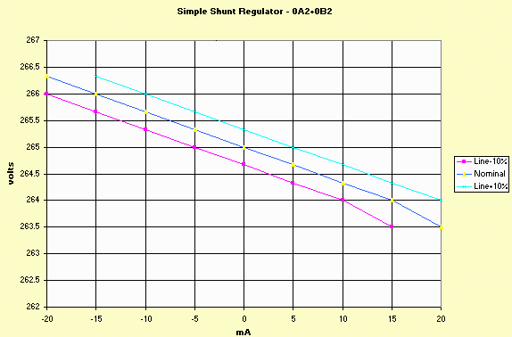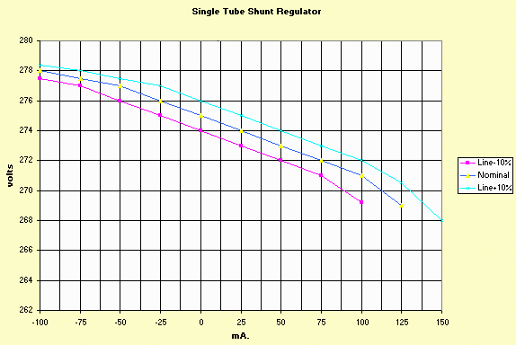 Note that the effective output resistance is about 40 ohms. Also note that the curves are notably different form the simple series regulator as I described above. (Specifically note that with series regulators, the regulation is "better" at high loads, and gets worse at low or negative loads. With the shunt regulator, the regulation is better at low or negative loads, and gets worse at high loads). Technically, since the tube is dissipating its rated power at zero load, "sourcing" current would over-dissipate the tube. For dynamic loads this is not a problem, since the power averaged over a load "cycle" would still be within limits.